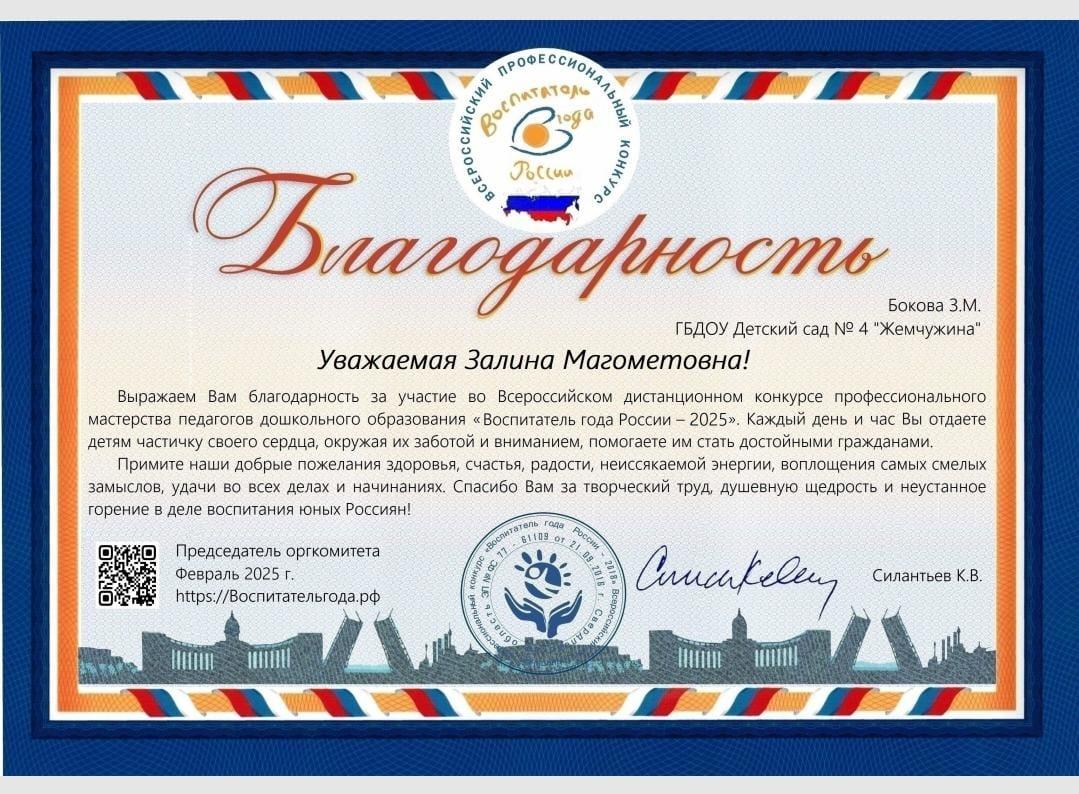 Кроме того, у нас появилась возможность принять участие в престижном всероссийском конкурсе"Воспитатель года России-2024",который проходил в подмосковном городе Красногорск. И мы не упустили эту возможность -наш воспитатель стала лауреатом этого замечательного конкурса.