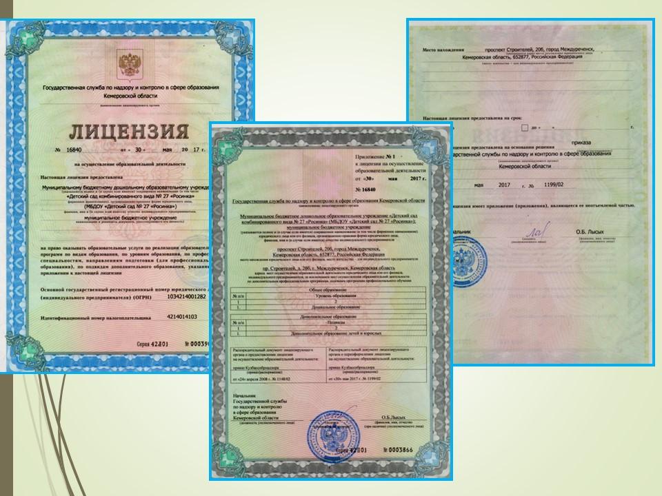 Действующая лицензия от 30 мая 2017 года, регистрационный № 16840, выдан Государственной службой по надзору и контролю в сфере образования Кемеровской области, бессрочна.