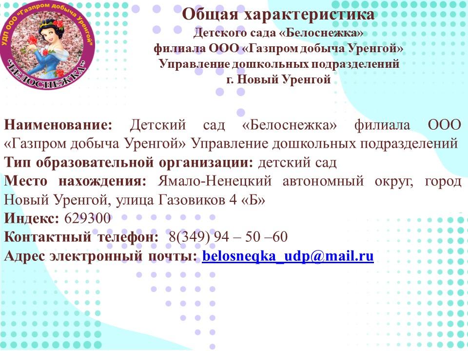 В дошкольном учреждении созданы условия для воспитания, обучения и развития, а также присмотра, ухода и оздоровления детей в возрасте от 1 года и до выпуска в школу.Функционирует 8 групп наполняемостью 175 человек, из них 6 групп общеразвивающей направленности и 2 группы компенсирующей направленности для детей с тяжелыми нарушениями речи.